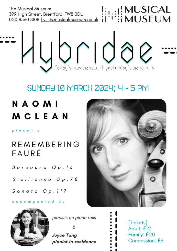 I have been quite absent from the blogging scene for a while. This post is to mark the launching of the first Hybridae concerts at the musical museum later today, starring the amazing cellist (and friend) Naomi Mclean. ‘Hybridae’ stems from word hybrid, and it is platform where I invite today’s musicians to play with myself, and with pianists on pianos rolls. Below is the program & program note: